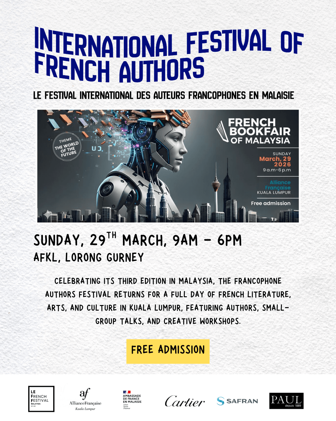 Celebrate Francophonie at the Festival des Auteurs Francophones, the third annual edition in Malaysia, held at AFKL. This event offers a full day dedicated to French literature, arts, and culture. Authors will sell and sign their books, host talks, and engage with visitors, alongside literary salons, creative workshops, partner booths, and on-site catering, bringing the Francophone community together in the heart of KL.