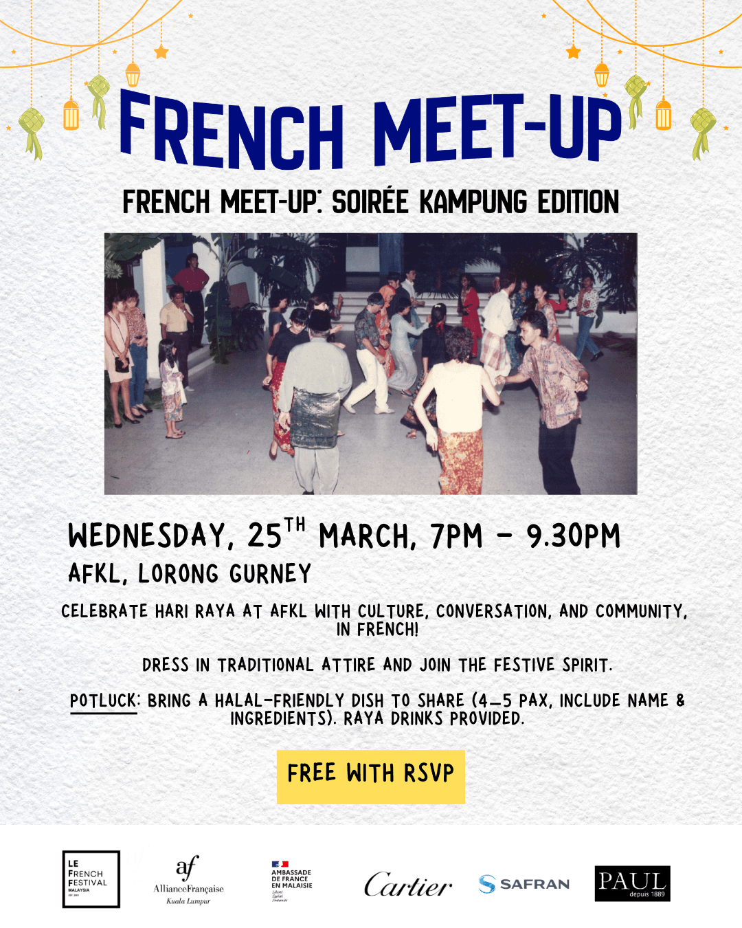 Join us for a cozy Hari Raya Soirée Kampung for this edition of French Meet Up, where balik kampung vibes meet a festive conversation circle. Wear traditional attire and bring a dish to share potluck-style. Celebrate together, enjoy delicious food, and practice your French in a warm, friendly atmosphere.