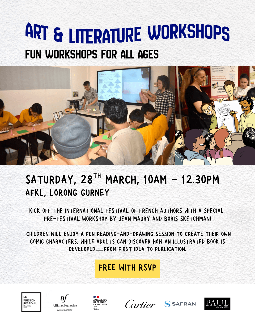 As part of the Festival des auteurs francophones, AFKL welcomes renowned French comic artist Jean Maury and illustrator Boris Sketchman for two inspiring sessions celebrating the art of visual storytelling. Jean Maury, known for his engaging approach to comics and education, will lead a creative workshop for children, while Boris Sketchman will present a conference for adults on the process of creating and publishing an illustrated book, offering valuable insights into the world of illustration and publishing.