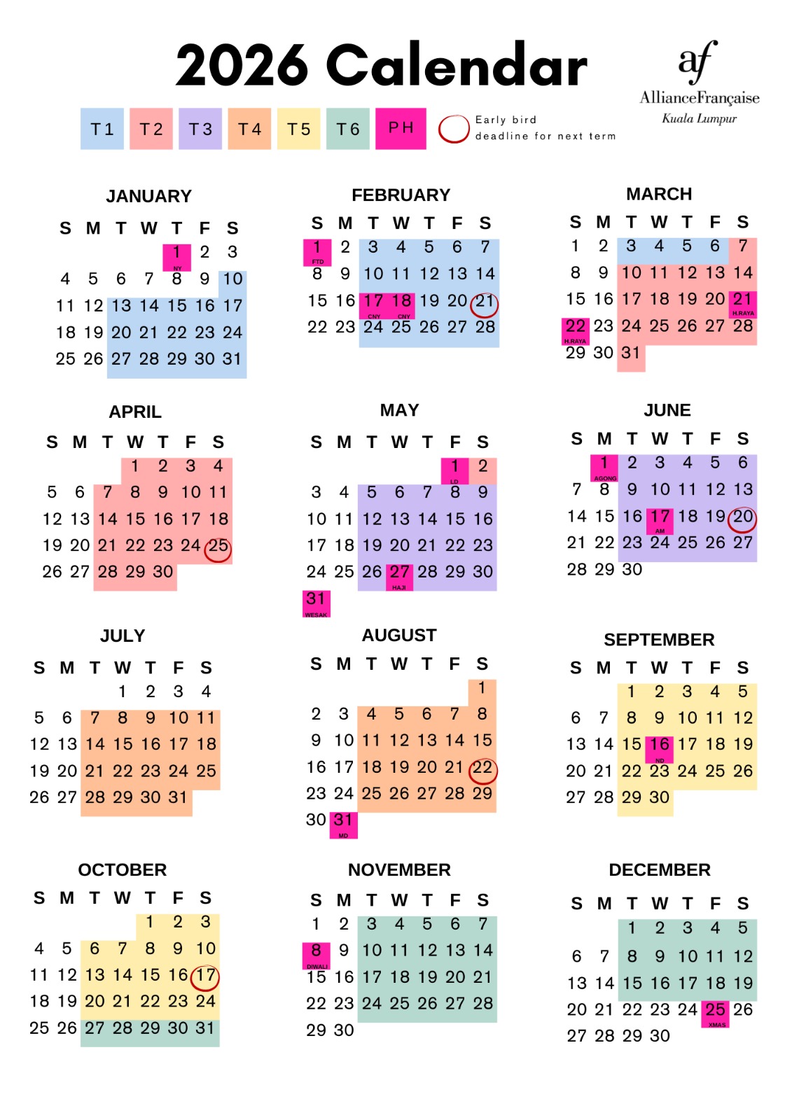 Please note that if Malaysian authorities announce a new public holiday for the Kuala Lumpur area with less than two months' notice, classes scheduled for that day will be canceled, and no replacement classes will be organized. We thank you for your kind understanding in this matter.